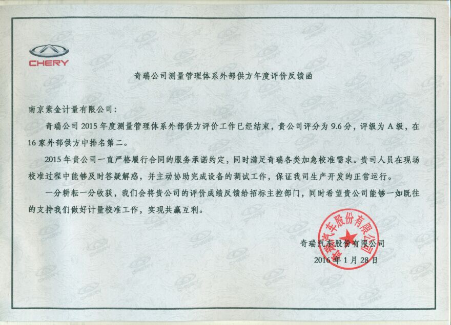 奇瑞汽车股份有限公司与我实验室合作十几年来,对我实验室的计量校准服务评价一直较高。2015年,该单位继续对测量管理体系外部供方共16家进行了评价,我实验室喜获了A级、排名第二的好成绩。并对评价结果发来了书面反馈函。